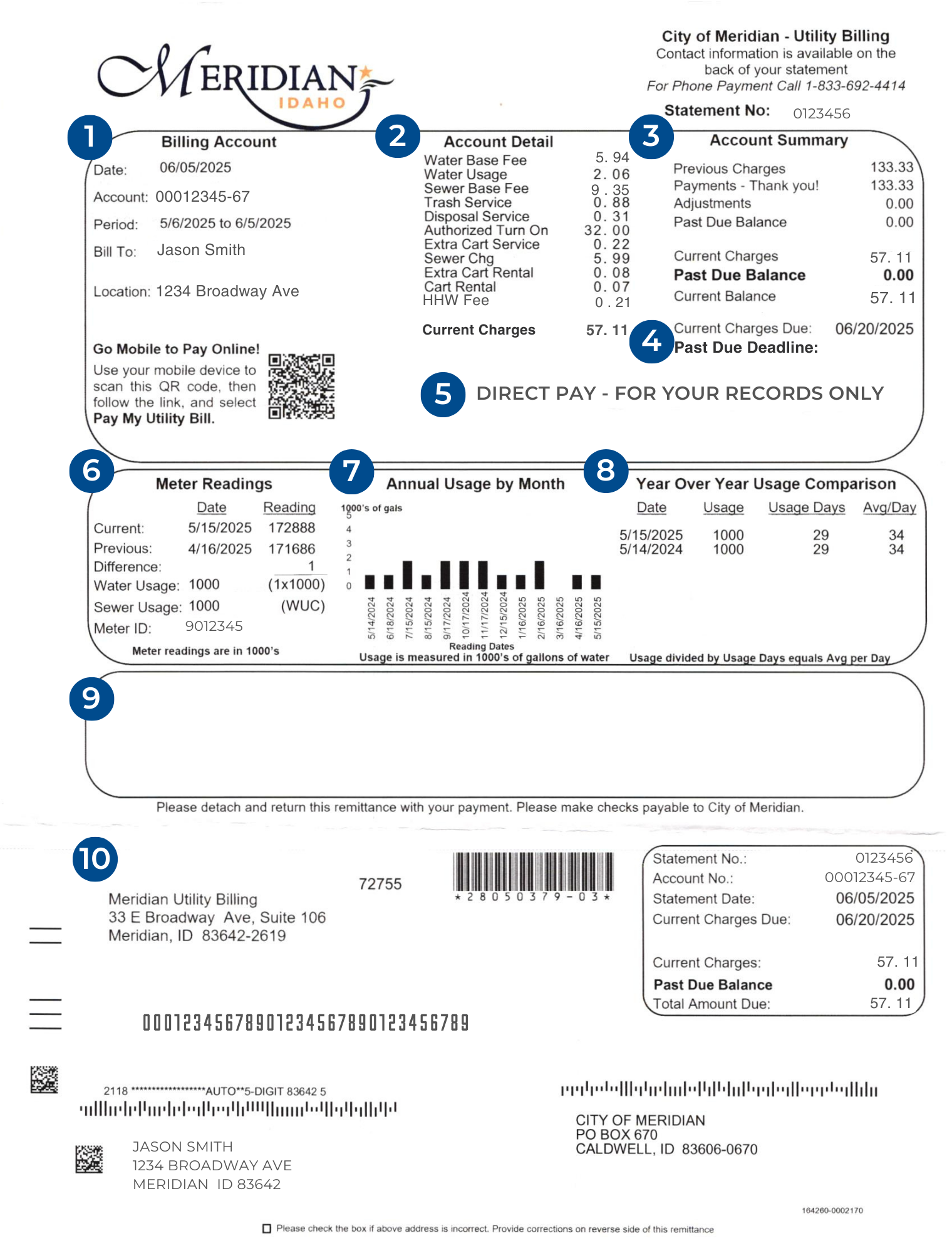 - Bill Remittance Stub - City address, account user's address, postal information (bar codes and other numbers), small box with the following: Statement No., Account No., Statement Date, Current Charges Due, Current Charges, Past Due Balance, and Total Amount Due, and the "mail to" address.
